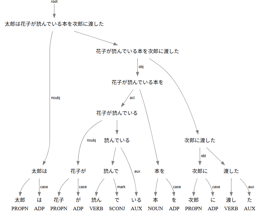 doc = nlp("太郎は花子が読んでいる本を次郎に渡した")