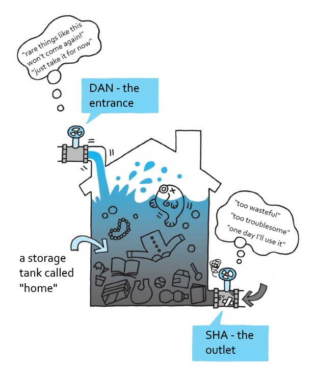Thus Danshari is not a one-time spring cleaning routine. It’s more like a continuous practice in which you continue to let in those that will bring wellness, refuse new and let go of existing items that is harmful. The target is to create a healthy flow of objects in and out of your life, instead of being stuck in the storage tank illustrated previously. What matters most is not what you discard, but the discovery of your existing patterns, deliberately choosing those that you really care for, and finally gaining a more thorough understanding of yourself.