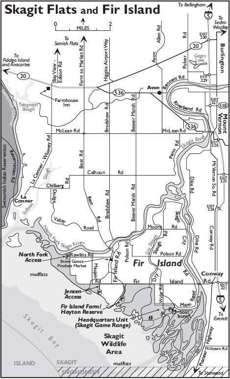 - Fir Island Farm Reserve (Hayton): A 225-acre non-hunting refuge with agricultural and restored intertidal estuary. An elevated dike provides 360-degree views of Snow Geese and Trumpeter Swans feeding in the fields and intertidal marshes.